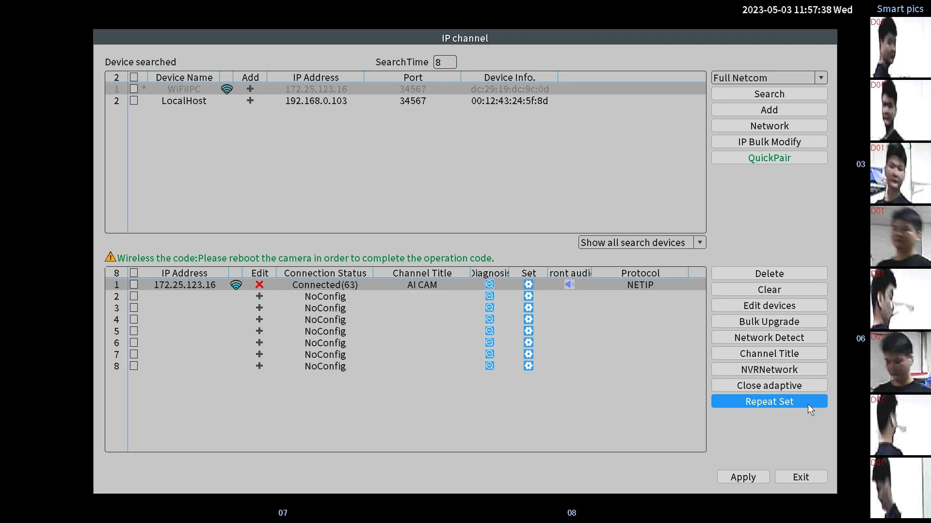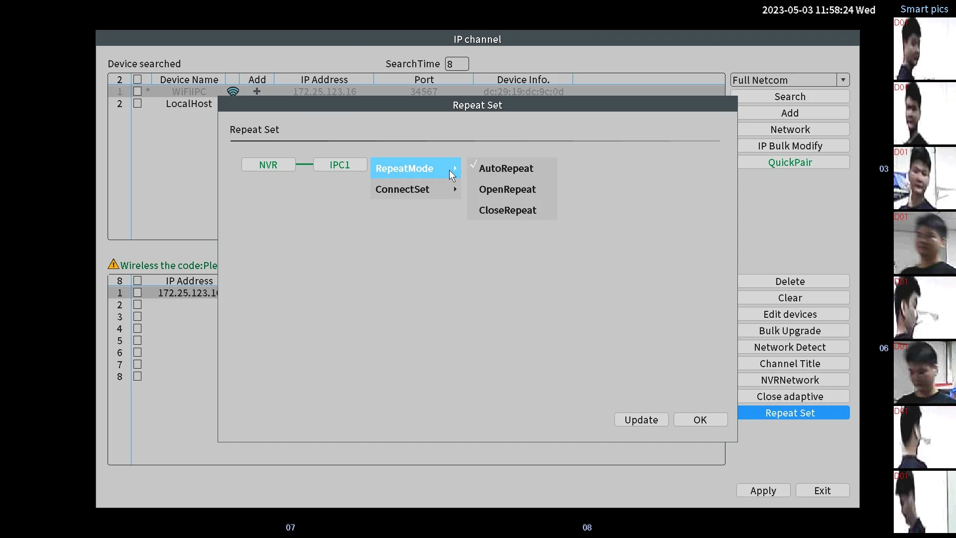 There are three Repeat Modes: Auto Repeat, OpenRepeat, CloseRepeat. Under normal circumstances, it is recommanded to set to Auto Repeat mode, Repeat Modes can be set in the pop-up option box when clicking the corresponding IPC Cameras.
