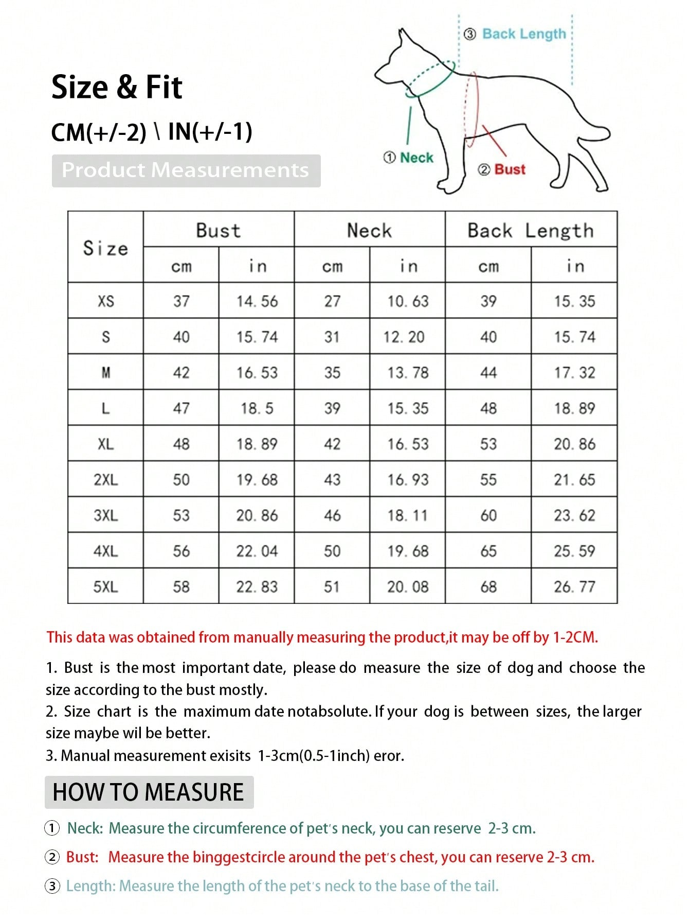 | Size | Back Length | Bust | Neck |