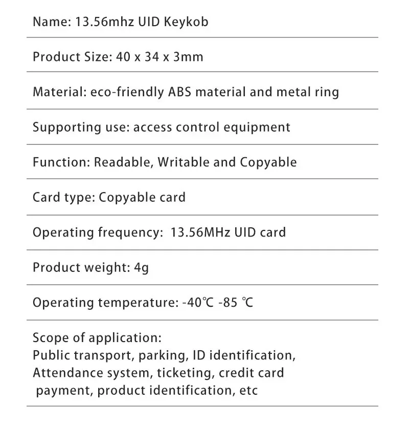 • Mif 1k S50 Writable :The Mif 1k S50 writable feature allows for easy and convenient modification of access control settings.