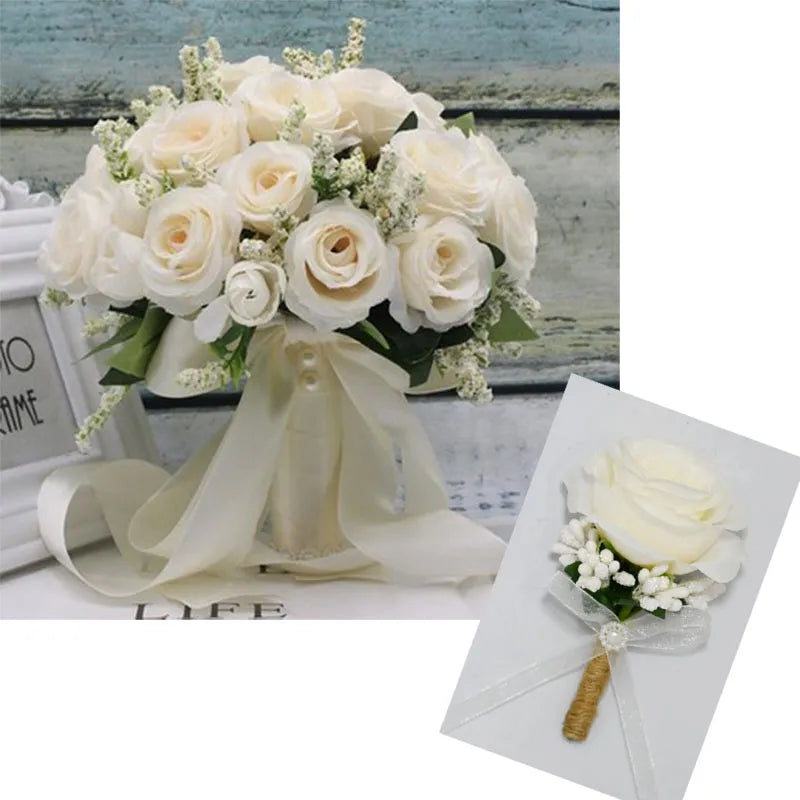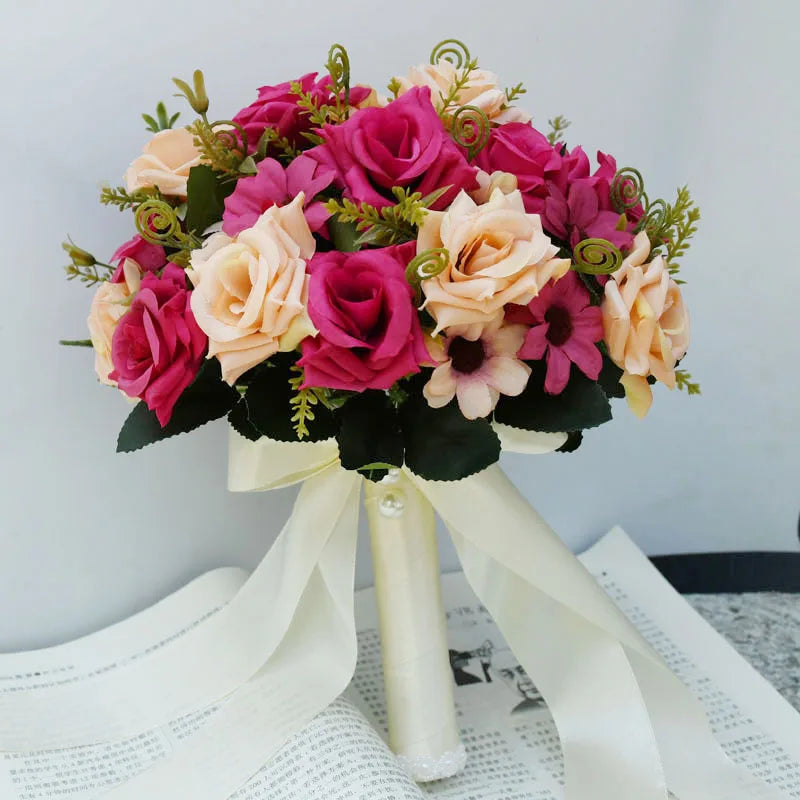 This stunning wedding bouquet features lifelike artificial roses, embellished with a silk satin ribbon in shades of pink, white, and champagne. Perfect for bridesmaids and bridal parties, this bouquet adds a touch of elegance to any wedding celebration. Experience the beauty of natural-looking flowers without the worry of wilting or allergies.