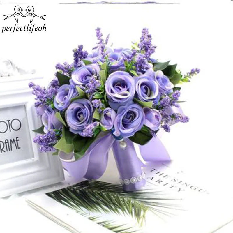Holding Flowers Artificial Natural Rose Wedding Bouquet with Silk Satin Ribbon Pink White Champagne Bridesmaid Bridal Party