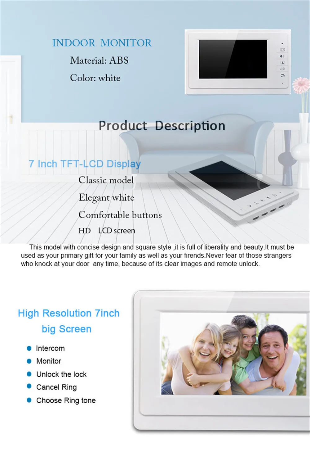 This Hard-wired Video Door phone Intercom System consists of one 7 inch color TFT monitor and one door camera. Upgraded chips are adopted for highly stable performance and it has a nice appearance. It is your perfect choice to use in villas with 700 lines CMOS camera, which can achievemonitoring, dual-way intercom and unlocking. You also can monitor outside image even without people pressing the Monitor button on the Indoor unit.