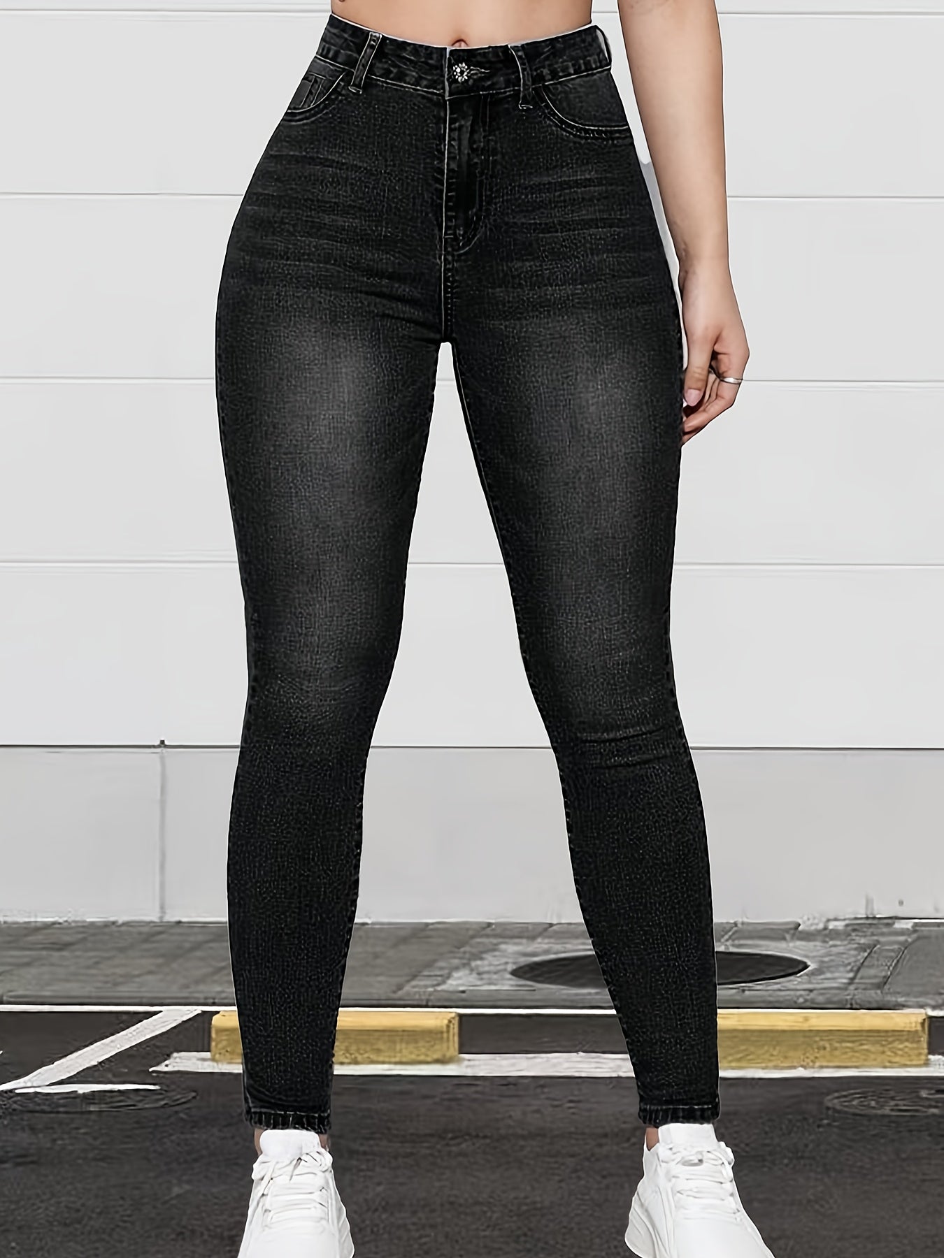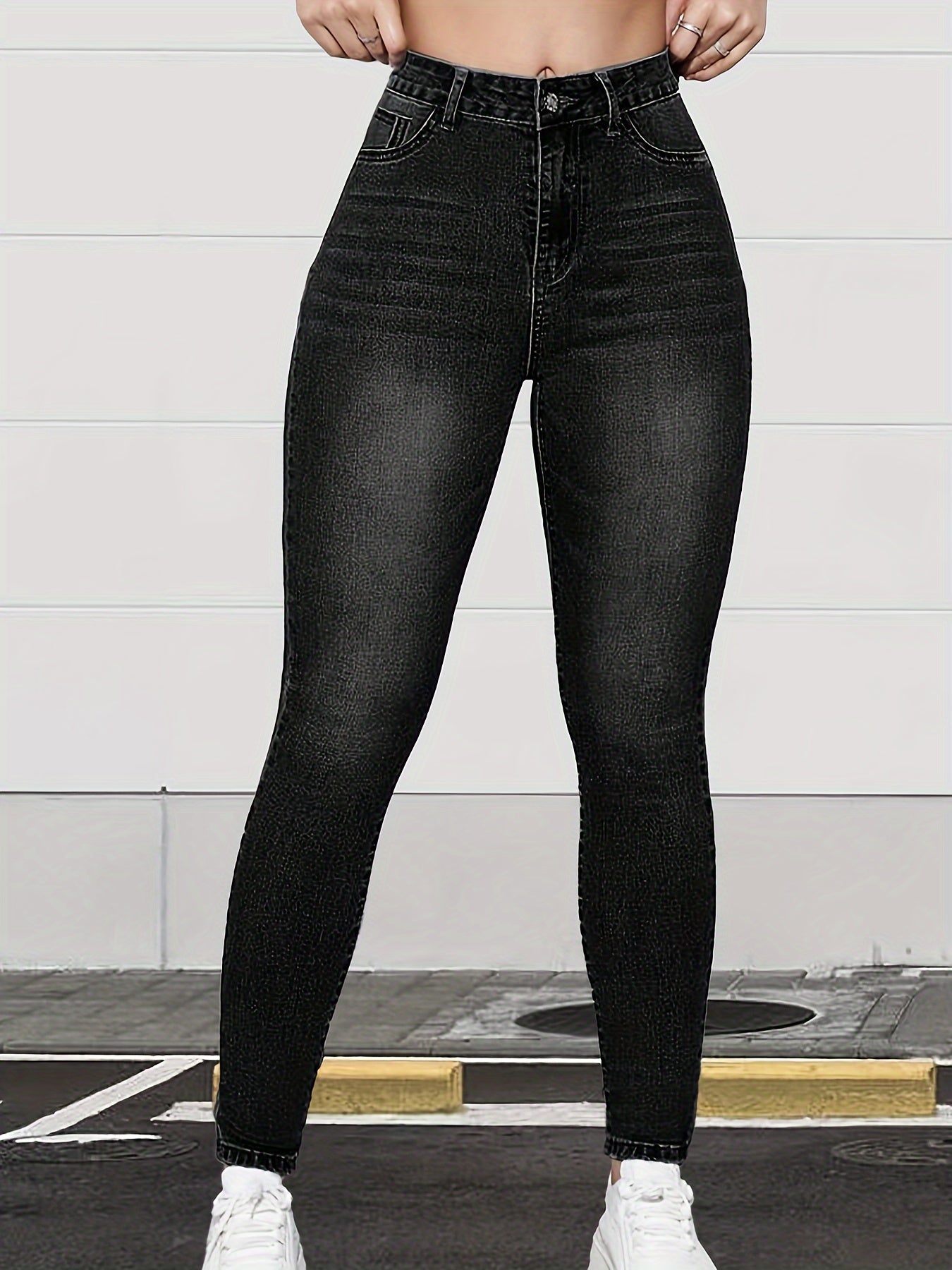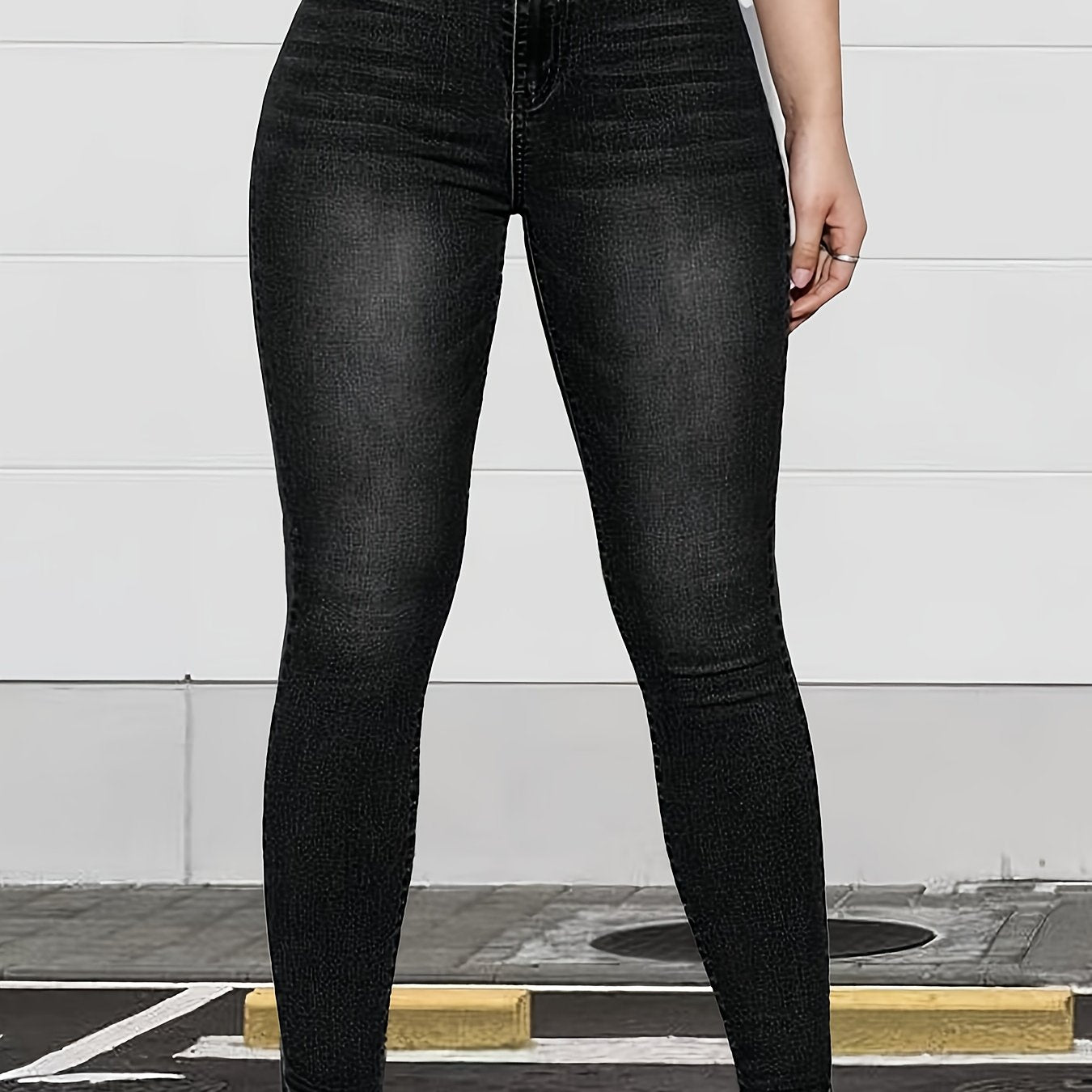 Plain Black Stretchy Denim Pants High Rise Slash Pockets